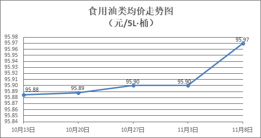 食用油类商品价格窄幅盘整。所监测的9种食用油(5L装)商品价格2涨4跌3平,综合零售均价为每桶95.97元,环比上涨0.07%。其中:胡姬花花生油、金龙鱼调和油零售均价为每桶146.00元、71.21元,环比上涨0.86%、下降0.11%。