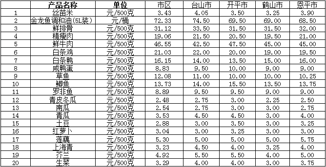 说明:1、表中价格为该地区监测点综合平均价;2、“市区”含蓬江区、江海区、新会区,价格分别采自蓬江市场、江南市场、城东市场等13家农贸市场;3、其他四个县市价格分别采自新华市场、锦江市场等8家农贸市场。