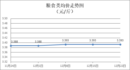 粮食类商品价格保持稳定。所监测的4种粮食类商品价格均持平,零售均价为每斤3.393元。其中:油粘米、富强粉零售均价分别为每斤3.52元、3.36元,环比均持平。