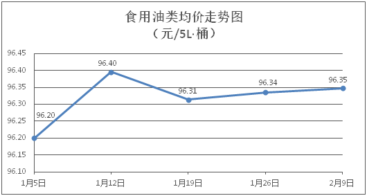 食用油类商品价格稳中微涨。所监测的9种食用油(5L装)商品价格波动情况为2涨7平,综合零售均价为每桶96.35元,环比上涨0.01%。其中:鲁花花生油、金龙鱼调和油零售均价为每桶155.96元、72.00元,环比分别上涨0.01%、上涨0.06%。