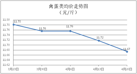 禽蛋类商品价格略有下降。所监测的5种禽蛋类商品价格波动情况为2涨3跌,综合零售均价为每斤11.67元,环比下降0.38%。其中:白条鸡、白条鸭零售均价分别为每斤20.57元、15.22元,环比分别上涨0.49%、下降0.13%;鸡蛋、鸭蛋零售均价分别为每斤6.21元、7.16元,环比分别下降1.11%、下降3.24%。