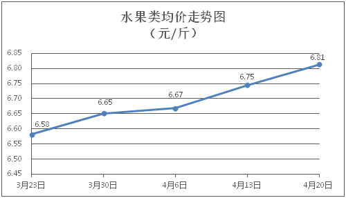 水果类商品价格小幅上涨。所监测的6种水果商品价格波动情况为4涨2跌,综合零售均价为每斤6.81元,环比上涨1.01%。其中橙子、香蕉、葡萄零售均价分别为每斤6.35元、3.36元、14.53元,环比分别上涨2.58%、上涨0.60%、上涨1.96%。
