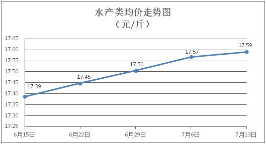 水产类商品价格总体微涨。所监测的9种水产商品价格波动情况为3涨4跌2平,综合均价为每斤17.59元,环比上涨0.13%。其中:草鱼、鲫鱼、淡水鲈鱼、基围虾零售均价分别为每斤11.18元、14.31元、22.82元、30.86元,环比分别下降0.18%、上涨0.14%、上涨0.80%、上涨0.52%。