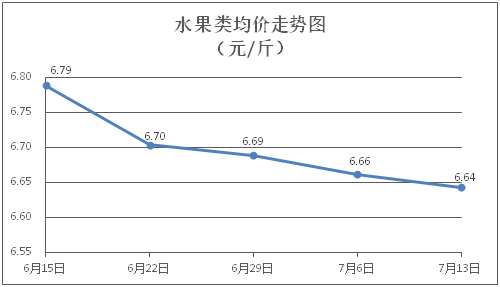 水果类商品价格稳中微降。所监测的6种水果商品价格波动情况为2跌4平,综合零售均价为每斤6.64元,环比下降0.28%。其中橙子、苹果、葡萄零售均价分别为每斤6.42元、7.64元、13.75元,环比分别持平、持平、下降0.88%。