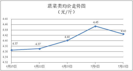 蔬菜类商品价格以降为主。所监测的32 种蔬菜商品价格波动情况为9涨19跌4平,综合零售均价为每斤4.43元,环比下降0.64%。其中:涨幅居前的品种包括莴笋、芥兰、水东芥菜,零售均价分别为每斤3.79元、5.18元、3.96元,环比分别上涨4.70%、2.78%、2.06%;跌幅靠前的品种包括丝瓜、青豆角、青皮冬瓜,零售均价分别为每斤4.57元、4.99元、2.50元,环比分别下降5.58%、3.48%、2.72%。