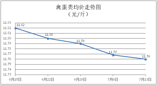 禽蛋类商品价格窄幅盘降。所监测的5种禽蛋类商品价格波动情况为1涨2跌2平,综合零售均价为每斤11.76元,环比下降0.07%。其中:白条鸡、白条鸭零售均价分别为每斤20.58元、15.42元,环比分别上涨0.15%、持平;鸡蛋、鸭蛋零售均价分别为每斤6.53元、7.11元,环比分别下降0.76%、持平。