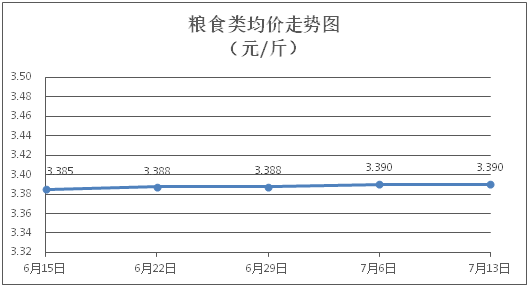 粮食类商品价格保持稳定。所监测的4种粮食类商品价格均持平,综合零售均价为每斤3.390元。其中:珍珠米、面粉零售均价分别为每斤3.10元、3.40元,环比均持平。