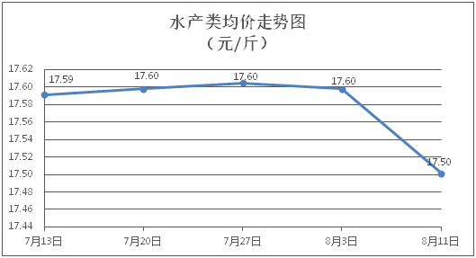 水产类商品价格有所下降。所监测的9种水产商品价格波动情况为3涨4跌2平,综合均价为每斤17.50元,环比下降0.55%。其中:草鱼、鳙鱼、鲈鱼、基围虾零售均价分别为每斤11.32元、10.69元、23.13元、29.79元,环比分别持平、下降0.65%、上涨0.26%、下降3.28%。