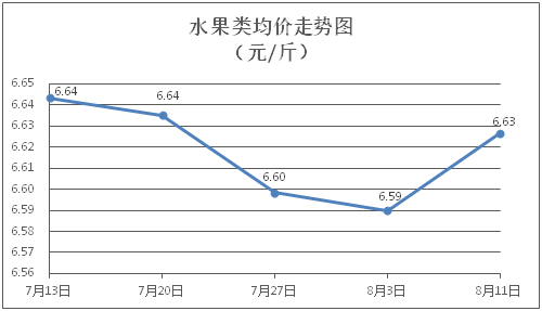 水果类商品价格涨跌互现。所监测的6种水果商品价格波动情况为3涨3跌,综合零售均价为每斤6.63元,环比上涨0.56%。其中橙子、香蕉、葡萄零售均价分别为每斤6.86元、3.29元、13.59元,环比分别上涨2.69%、下降1.50%、下降0.07%。