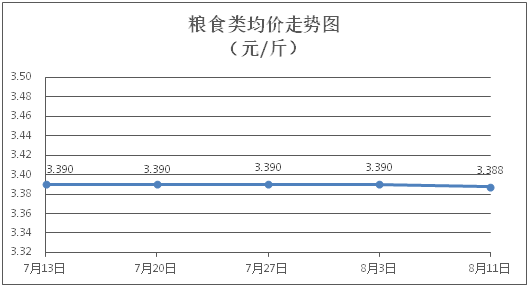粮食类商品价格基本平稳。所监测的4种粮食类商品价格波动情况为1跌3平,综合零售均价为每斤3.388元,环比下降0.07%。其中:珍珠米、面粉零售均价分别为每斤3.10元、3.39元,环比分别持平、下降0.29%。