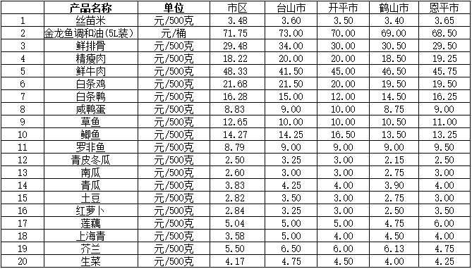 说明:1、表中价格为该地区监测点上周综合平均价;2、“市区”含蓬江区、江海区、新会区,价格分别采自蓬江市场、江南市场、城东市场等13家农贸市场;3、其他四个县市价格分别采自新华市场、锦江市场等8家农贸市场。