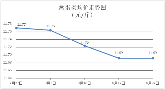 禽蛋类商品价格窄幅波动。所监测的5种禽蛋类商品价格波动情况为3涨2跌,综合零售均价为每斤11.69元,环比持平。其中:白条鸡、白条鸭零售均价分别为每斤20.79元、15.22元,环比分别上涨0.48%、上涨0.07%;鸡蛋、鸭蛋零售均价分别为每斤6.31元、7.10元,环比分别下降0.94%、上涨0.28%。