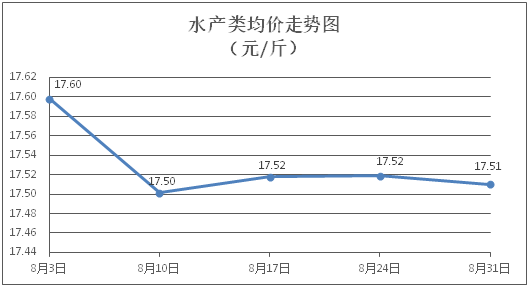 水产类商品价格总体略降。所监测的9种水产商品价格波动情况为3涨5跌1平,综合均价为每斤17.51元,环比下降0.05%。其中:草鱼、鲫鱼、罗非鱼、基围虾零售均价分别为每斤11.46元、14.25元、8.94元、29.35元,环比分别上涨0.97%、下降0.56%、下降0.45%、下降0.10%。