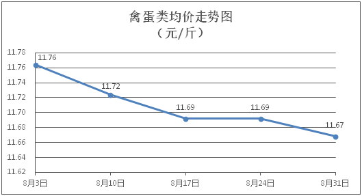 禽蛋类商品价格微幅下降。所监测的5种禽蛋类商品价格波动情况为3跌2平,综合零售均价为每斤11.67元,环比下降0.21%。其中:白条鸡、白条鸭零售均价分别为每斤20.72元、15.20元,环比分别下降0.34%、下降0.13%;鸡蛋、鸭蛋零售均价分别为每斤6.31元、7.07元,环比分别持平、下降0.42%。