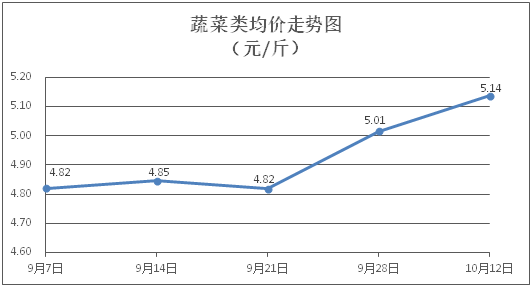 蔬菜类商品价格普遍上涨。所监测的32 种蔬菜商品价格波动情况为24涨8跌,综合零售均价为每斤5.14元,环比上涨2.44%。其中:涨幅居前的品种包括西洋菜、莴笋、青尖椒,零售均价分别为每斤6.11元、5.07元、5.78元,环比分别上涨12.32%、10.70%、10.52%;跌幅靠前的品种为红萝卜、南瓜、青皮冬瓜,零售均价分别为每斤2.90元、2.70元、2.59元,环比分别下降3.97%、2.17%、1.15%。