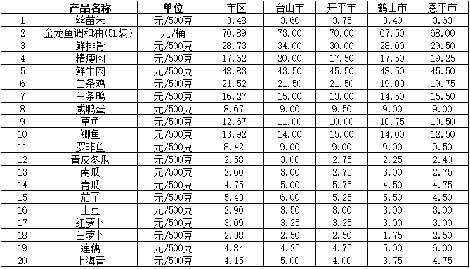 说明:1、表中价格为该地区监测点综合平均价;2、“市区”含蓬江区、江海区、新会区,价格分别采自蓬江市场、江南市场、城东市场等13家农贸市场;3、其他四个县市价格分别采自新华市场、锦江市场等8家农贸市场。