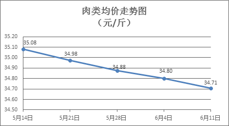 肉类商品价格总体微降。上周所监测的8种肉类商品价格波动情况为2涨6跌,综合零售均价为34.71元/斤,环比下降0.27%。其中:排骨、精瘦肉、有皮上肉、牛肉、带骨羊肉零售均价分别为每斤28.69元、18.27元、14.06元、54.53元、45.57元,环比分别下降0.07%、下降0.87%、上涨0.36%、下降0.27%、下降0.59%。
