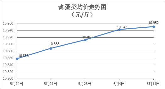 禽蛋类商品价格微幅盘升。上周所监测的6种禽蛋类商品价格波动情况为4涨1跌1平,综合零售均价为10.952元/斤,环比上涨0.08%。其中:白条鸡、白条鸭零售均价分别为每斤19.75元、15.66元,环比分别上涨0.10%、上涨0.19%;白壳鸡蛋、鸭蛋零售均价分别为每斤6.76元、7.93元,环比分别上涨0.45%、持平。