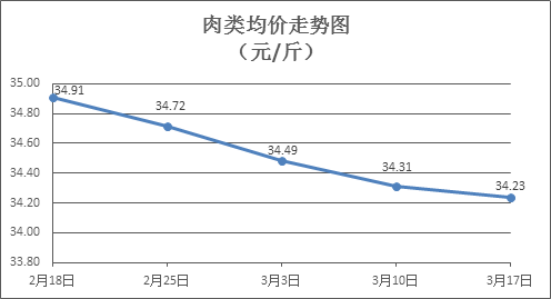 肉类商品价格普遍微降。上周所监测的8种肉类商品价格波动情况为6跌2平,综合零售均价34.23元/斤,环比下降0.22%。其中:排骨、精瘦肉、有皮上肉、牛肉、带骨羊肉零售均价分别为每斤29.70元、18.45元、14.69元、53.54元、44.75元,环比分别持平、持平、下降0.41%、下降0.21%、下降0.25%。