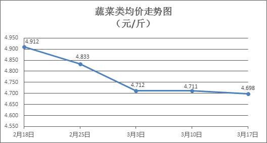蔬菜类商品价格升降互现。上周所监测的32 种蔬菜商品价格波动情况为11涨19跌2平,综合零售均价为4.698元/斤,环比下降0.27%。其中:涨幅居前的品种包括水空心菜、黄瓜、苦瓜,零售均价分别为每斤6.09元、4.24元、5.87元,环比分别上涨6.47%、6.27%、5.01%;跌幅靠前的品种包括白苋菜、蒜苔、菠菜,零售均价分别为每斤4.31元、9.40元、4.71元,环比分别下降5.48%、下降4.47%、下降3.68%。