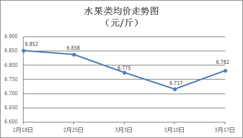 水果类商品价格小幅波动。上周所监测的6种水果商品价格波动情况为1涨5跌,综合零售均价为6.782元/斤,环比上涨0.97%。其中橙子、苹果、葡萄零售均价分别为每斤5.19元、7.39元、15.84元,环比分别下降0.19%、下降0.54%、上涨3.33%。