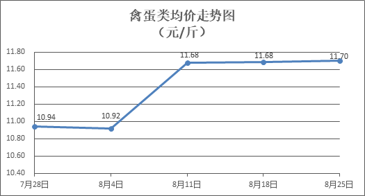 禽蛋类商品价格稳中微涨。所监测的5种禽蛋类商品价格波动情况为4涨1平,综合零售均价为每斤11.70元,环比上涨0.15%。其中:白条鸡、白条鸭零售均价分别为每斤20.05元、15.24元,环比分别上涨0.15%、上涨0.07%;白壳鸡蛋、鸭蛋零售均价分别为每斤6.52元、7.70元,环比分别上涨0.46%、上涨0.26%。