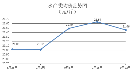 水产类商品价格略有下降。所监测的9种水产商品价格波动情况为2涨6跌1平,综合均价为每斤21.46元,环比下降0.83%。其中:草鱼、鲫鱼、罗非鱼、海虾零售均价分别为每斤11.14元、13.80元、9.00元、52.50元,环比分别下降0.45%、下降3.16%、上涨0.45%、下降2.63%。