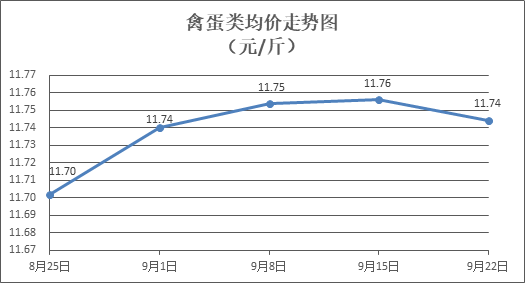 禽蛋类商品价格小幅波动。所监测的5种禽蛋类商品价格波动情况为2涨3跌,综合零售均价为每斤11.74元,环比下降0.10%。其中:白条鸡、白条鸭零售均价分别为每斤20.17元、15.32元,环比分别上涨0.35%、下降0.13%;鸡蛋、咸鸭蛋零售均价分别为每斤6.54元、9.06元,环比分别上涨0.31%、下降0.11%。