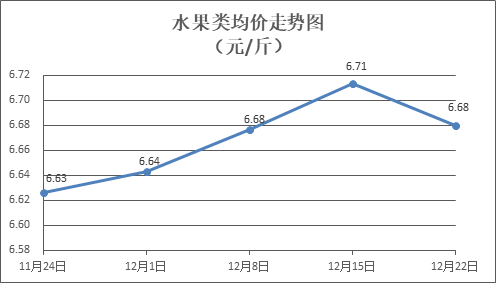 水果类商品价格普遍下降。所监测的6种水果商品价格波动情况为4跌2平,综合零售均价为每斤6.68元,环比下降0.50%。其中橙子、苹果、葡萄零售均价分别为每斤5.96元、7.43元、13.96元,环比分别下降0.50%、下降0.40%、下降0.71%。
