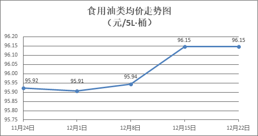 食用油类商品价格稳中微降。所监测的9种食用油(5L装)商品价格波动情况为1涨4跌4平,综合零售均价为每桶96.15元,环比下降0.01%。其中:金龙鱼花生油、大豆油零售均价为每桶103.20元、62.53元,环比分别下降0.09%、下降0.08%。