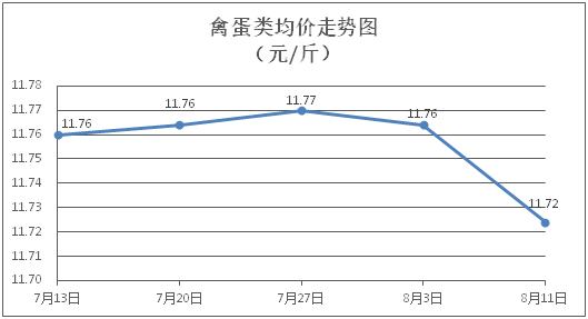 禽蛋类商品价格总体略降。所监测的5种禽蛋类商品价格波动情况为2涨2跌1平,综合零售均价为每斤11.72元,环比下降0.34%。其中:白条鸡、白条鸭零售均价分别为每斤20.77元、15.21元,环比分别上涨0.53%、下降1.36%;鸡蛋、鸭蛋零售均价分别为每斤6.42元、7.08元,环比分别下降1.68%、上涨0.14%。