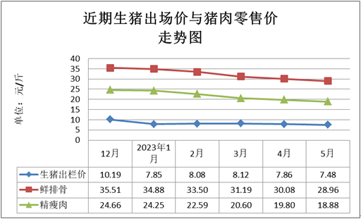 5月我市生猪、仔猪出场价小幅下降,出栏均价分别为每公斤14.96元、38.20元,环比分别下降4.83%、下降0.08%,同比分别下降18.16%、下降6.53%;猪肉商品零售价格,鲜排骨、精瘦肉、有皮上肉、肋条肉零售均价分别为每斤28.96元、18.88元、14.21元、14.92元,环比分别下降3.72%、下降4.65%、下降4.50%、下降4.11%,同比分别下降0.89%、下降0.32%、下降0.42%、上涨0.67%;饲料类价格,玉米、豆粕、麦皮购进均价分别为每公斤2.82元、4.34元、2.45元,环比分别下降3.09%、上涨8.50%、持平,同比分别下降4.73%、上涨1.40%、上涨6.52%。