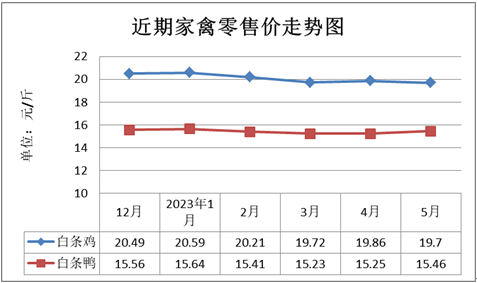 5月白条鸡、白条鸭零售均价分别为每斤19.70元、15.46元,环比分别下降0.81%、上涨1.38%,同比分别上涨4.40%、上涨8.64%;白壳鸡蛋、鸭蛋零售均价分别为每斤6.75元、7.87元,环比分别下降2.46%、上涨0.77%,同比分别上涨3.53%、上涨9.46%。