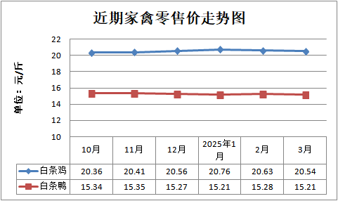 白条鸡、白条鸭零售均价分别为每斤20.54元、15.21元,环比分别下降0.44%、下降0.46%,同比分别上涨1.33%、上涨1.26%;鸡蛋、鸭蛋零售均价分别为每斤6.38元、7.60元,环比分别下降3.48%、下降0.65%,同比分别下降1.85%、下降1.17%。