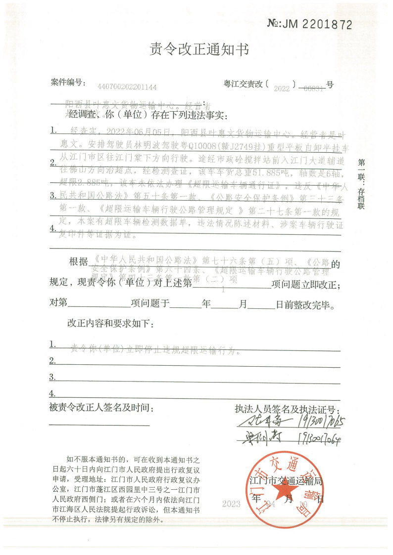 你(单位)因违反交通运输行政管理法规,本机关已作出行政处罚决定和责令改正通知书(具体内容详见附件)。依照《中华人民共和国民事诉讼法》第九十二条的规定,因受送达人采用其他方式无法送达,现向你(单位)公告送达《行政处罚决定书》和《责令改正通知书》。自公告之日起,经过30日即视为送达。