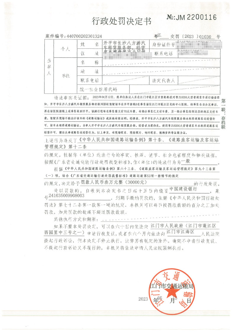 你(单位)因违反交通运输行政管理法规,本机关已作出行政处罚决定和责令改正通知书(具体内容详见附件)。依照《中华人民共和国民事诉讼法》第九十二条的规定,因受送达人采用其他方式无法送达,现向你(单位)公告送达《行政处罚决定书》和《责令改正通知书》。自公告之日起,经过30日即视为送达。