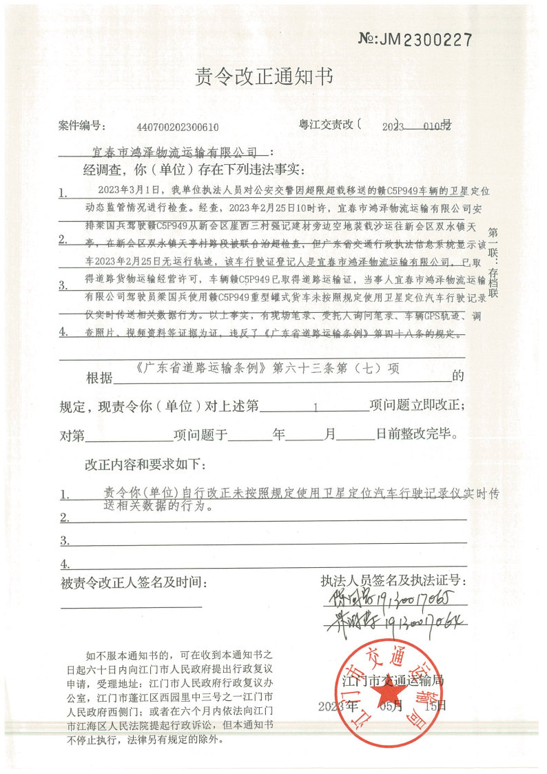你(单位)因违反交通运输行政管理法规,本机关已作出行政处罚决定和责令改正通知书(具体内容详见附件)。依照《中华人民共和国民事诉讼法》第九十二条的规定,因受送达人采用其他方式无法送达,现向你(单位)公告送达《行政处罚决定书》和《责令改正通知书》。自公告之日起,经过30日即视为送达。