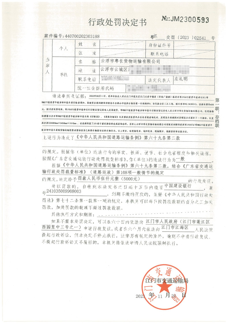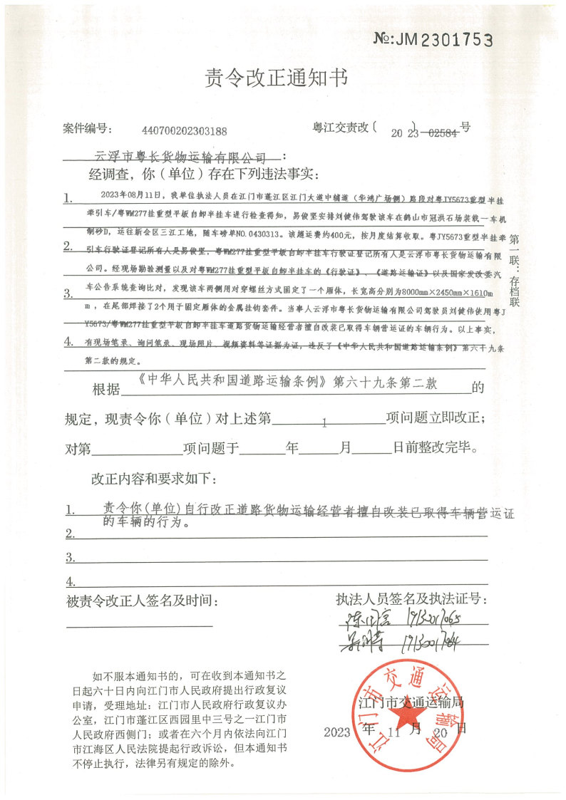 你(单位)因违反交通运输行政管理法规,本机关已作出行政处罚决定和责令改正通知书(具体内容详见附件)。依照《中华人民共和国民事诉讼法》第九十二条的规定,因受送达人采用其他方式无法送达,现向你(单位)公告送达《行政处罚决定书》和《责令改正通知书》。自公告之日起,经过30日即视为送达。