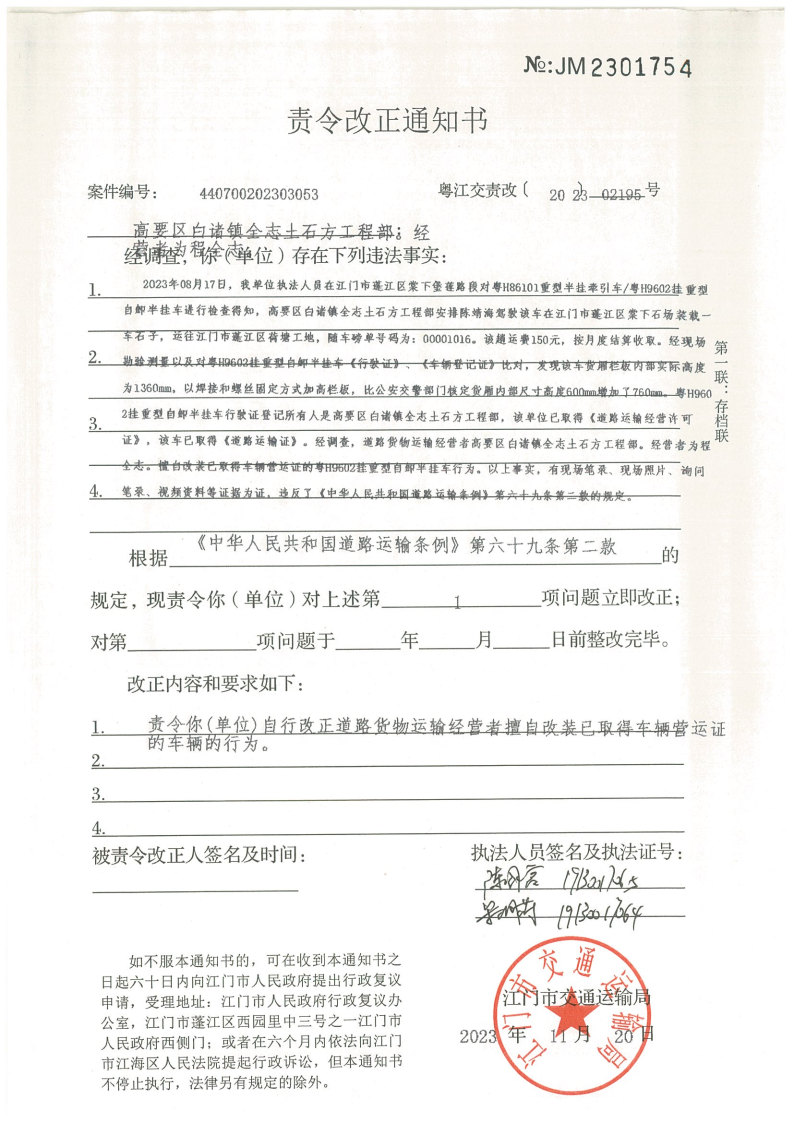 你(单位)因违反交通运输行政管理法规,本机关已作出行政处罚决定和责令改正通知书(具体内容详见附件)。依照《中华人民共和国民事诉讼法》第九十二条的规定,因受送达人采用其他方式无法送达,现向你(单位)公告送达《行政处罚决定书》和《责令改正通知书》。自公告之日起,经过30日即视为送达。