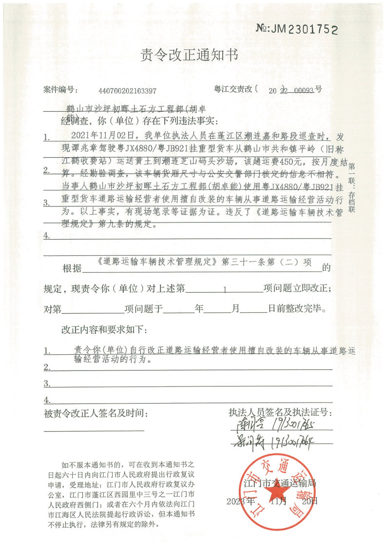 你(单位)因违反交通运输行政管理法规,本机关已作出行政处罚决定和责令改正通知书(具体内容详见附件)。依照《中华人民共和国民事诉讼法》第九十二条的规定,因受送达人采用其他方式无法送达,现向你(单位)公告送达《行政处罚决定书》和《责令改正通知书》。自公告之日起,经过30日即视为送达。