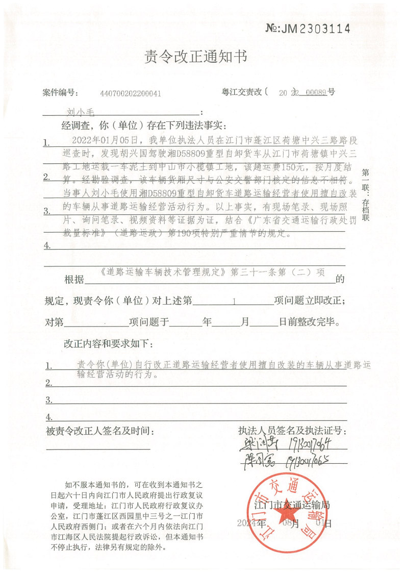 你(单位)因违反交通运输行政管理法规,本机关已作出行政处罚决定和责令改正通知书(具体内容详见附件)。依照《中华人民共和国民事诉讼法》第九十五条的规定,因受送达人采用其他方式无法送达,现向你(单位)公告送达《行政处罚决定书》和《责令改正通知书》。自公告之日起,经过30日即视为送达。