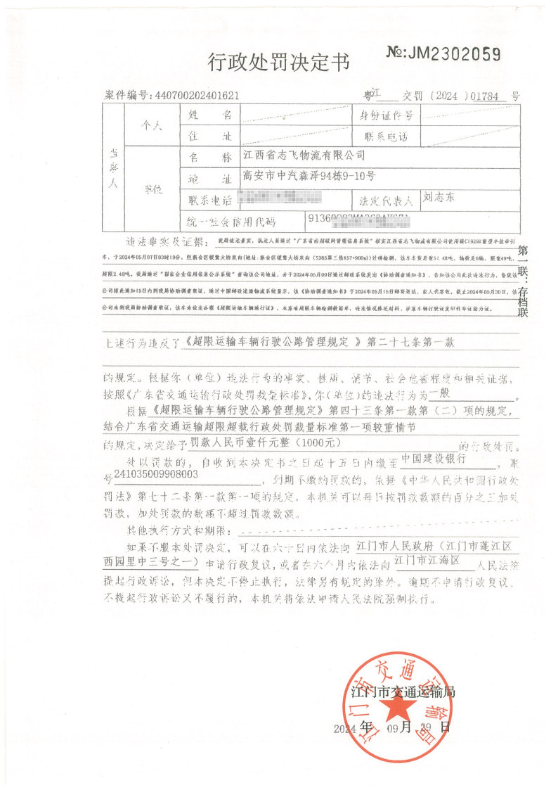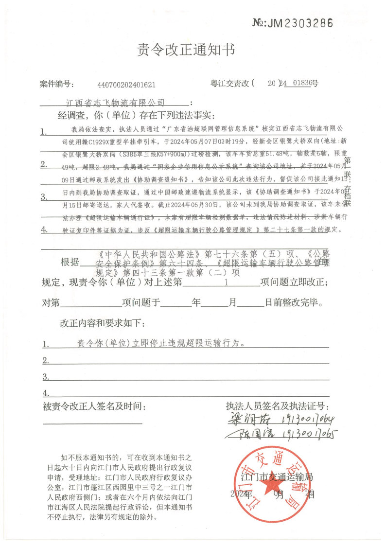 你(单位)因违反交通运输行政管理法规,本机关已作出行政处罚决定和责令改正通知书(具体内容详见附件)。依照《中华人民共和国民事诉讼法》第九十五条的规定,因受送达人采用其他方式无法送达,现向你(单位)公告送达《行政处罚决定书》和《责令改正通知书》。自公告之日起,经过30日即视为送达。