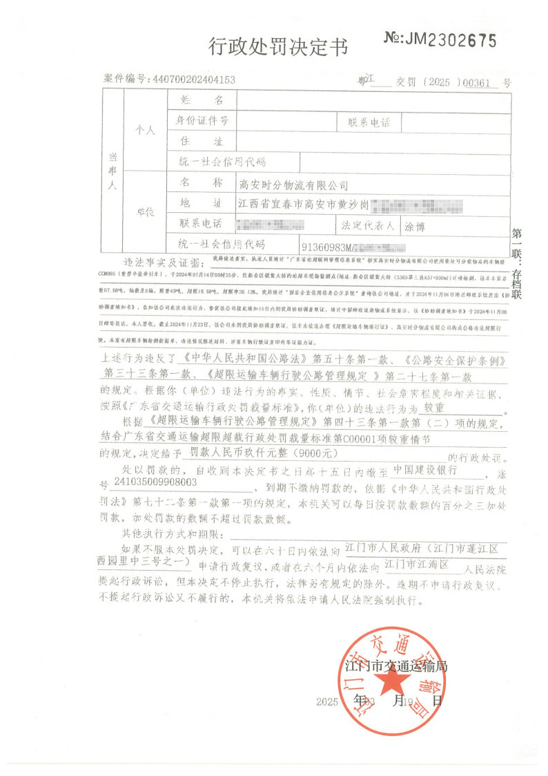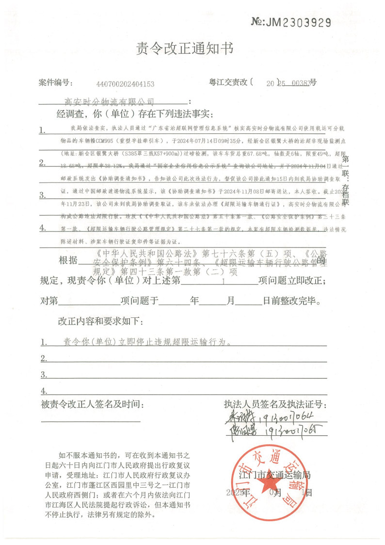 你(单位)因违反交通运输行政管理法规,本机关已作出行政处罚决定和责令改正通知书(具体内容详见附件)。依照《中华人民共和国民事诉讼法》第九十五条的规定,因受送达人采用其他方式无法送达,现向你(单位)公告送达《行政处罚决定书》和《责令改正通知书》。自公告之日起,经过30日即视为送达。