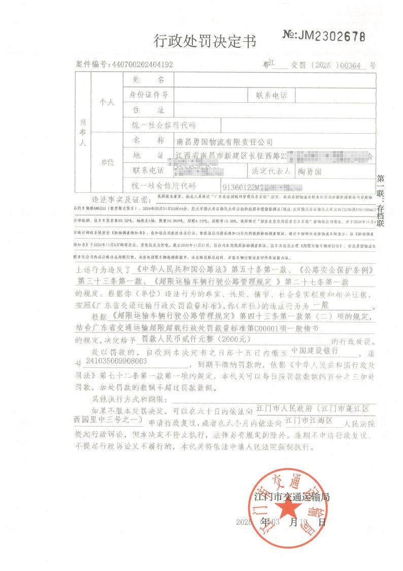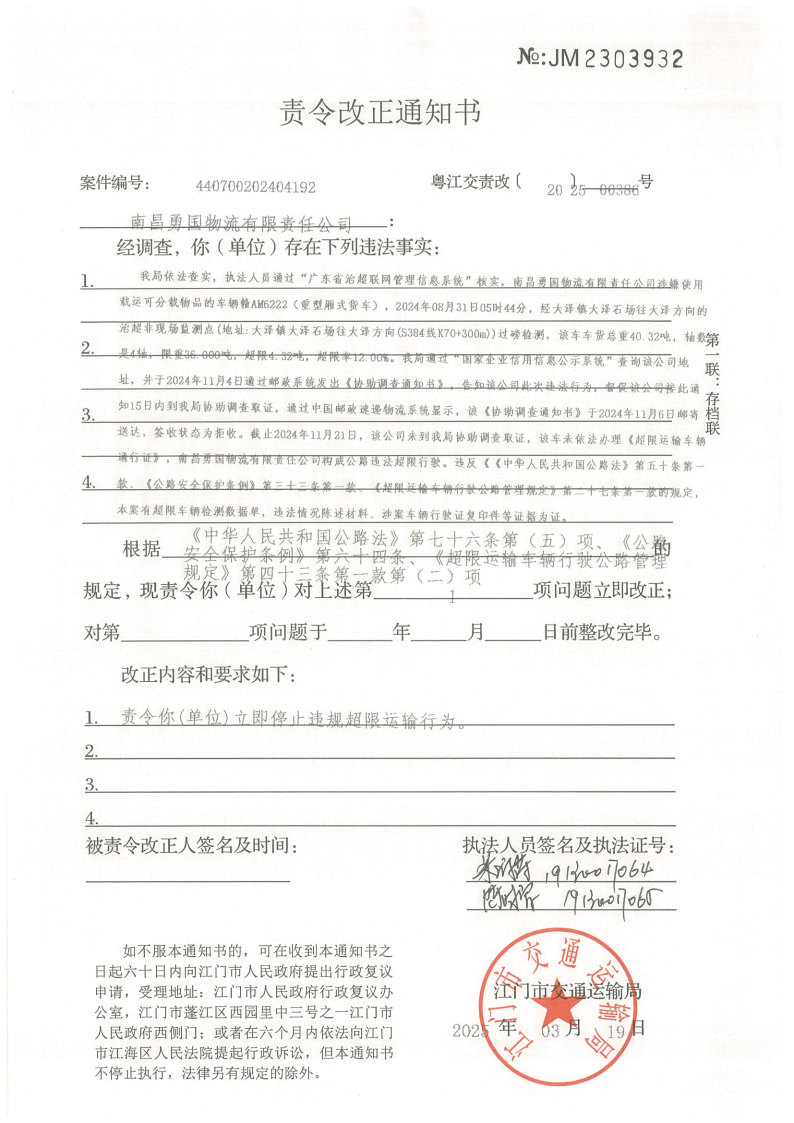 你(单位)因违反交通运输行政管理法规,本机关已作出行政处罚决定和责令改正通知书(具体内容详见附件)。依照《中华人民共和国民事诉讼法》第九十五条的规定,因受送达人采用其他方式无法送达,现向你(单位)公告送达《行政处罚决定书》和《责令改正通知书》。自公告之日起,经过30日即视为送达。