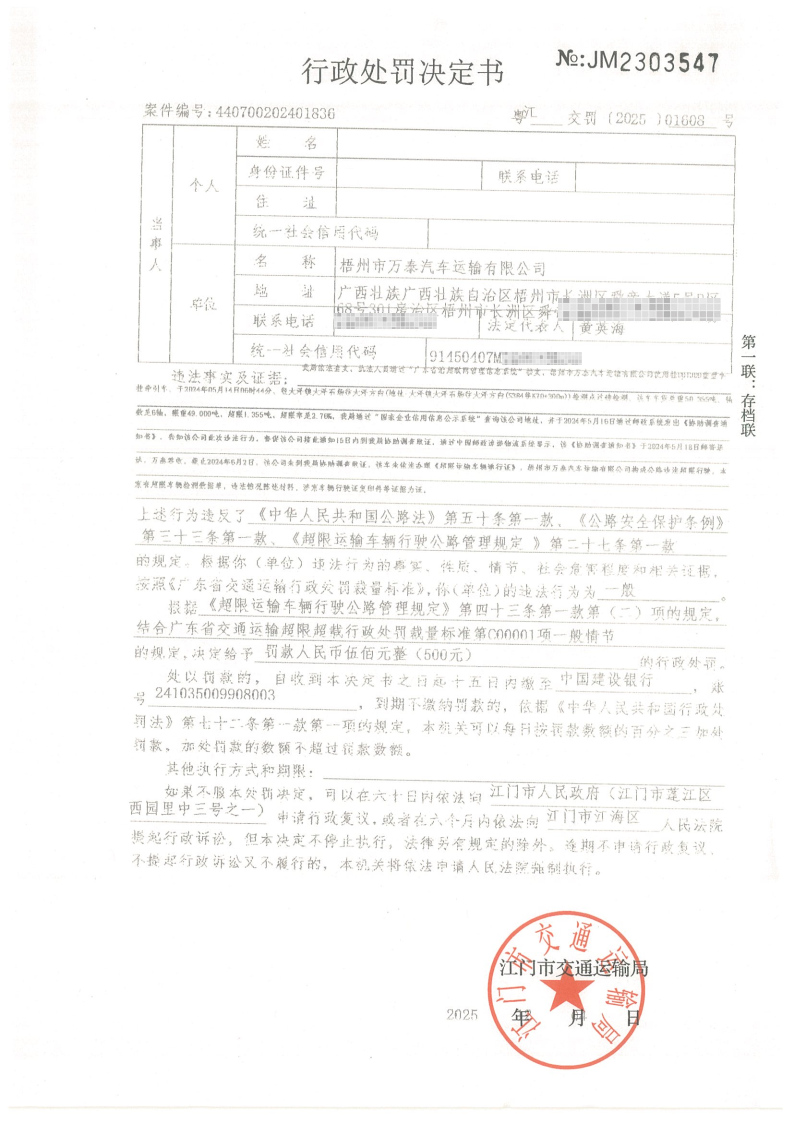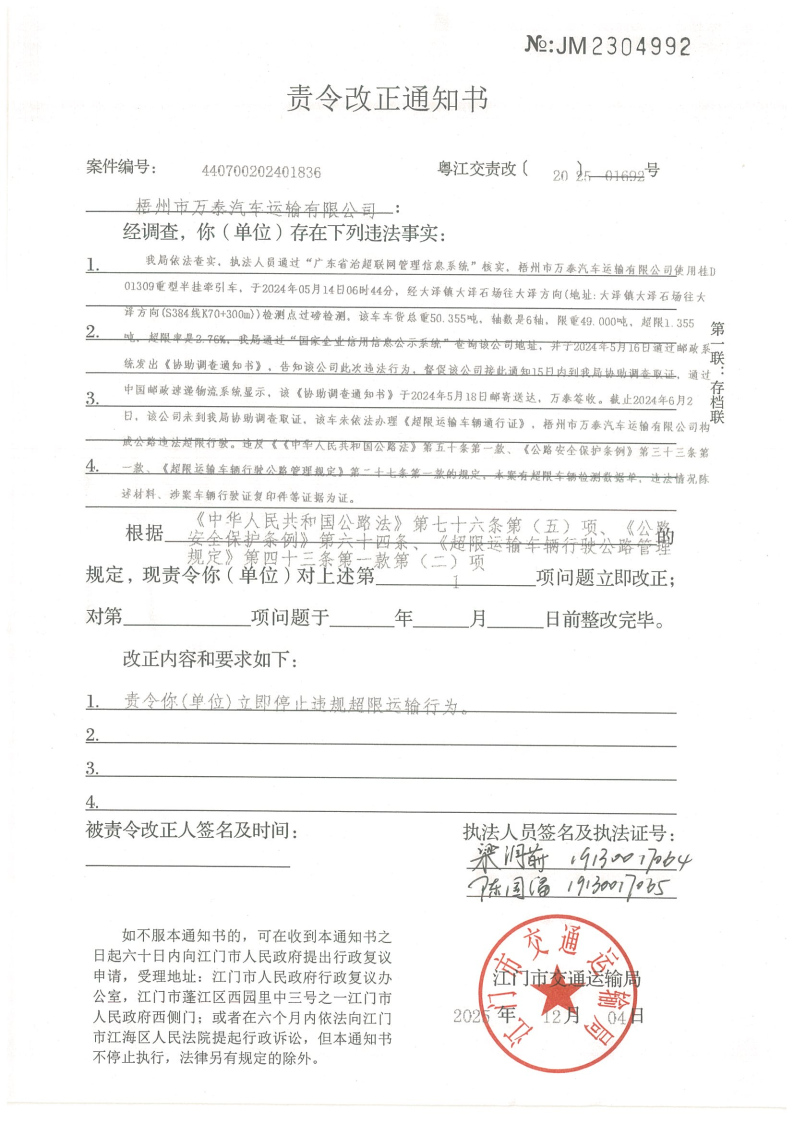 你(单位)因违反交通运输行政管理法规,本机关已作出行政处罚决定和责令改正通知书(具体内容详见附件)。依照《中华人民共和国民事诉讼法》第九十五条的规定,因无法以其他方式向你(单位)送达,现向你(单位)公告送达《行政处罚决定书》和《责令改正通知书》。自发出公告之日起,经过30日即视为送达。