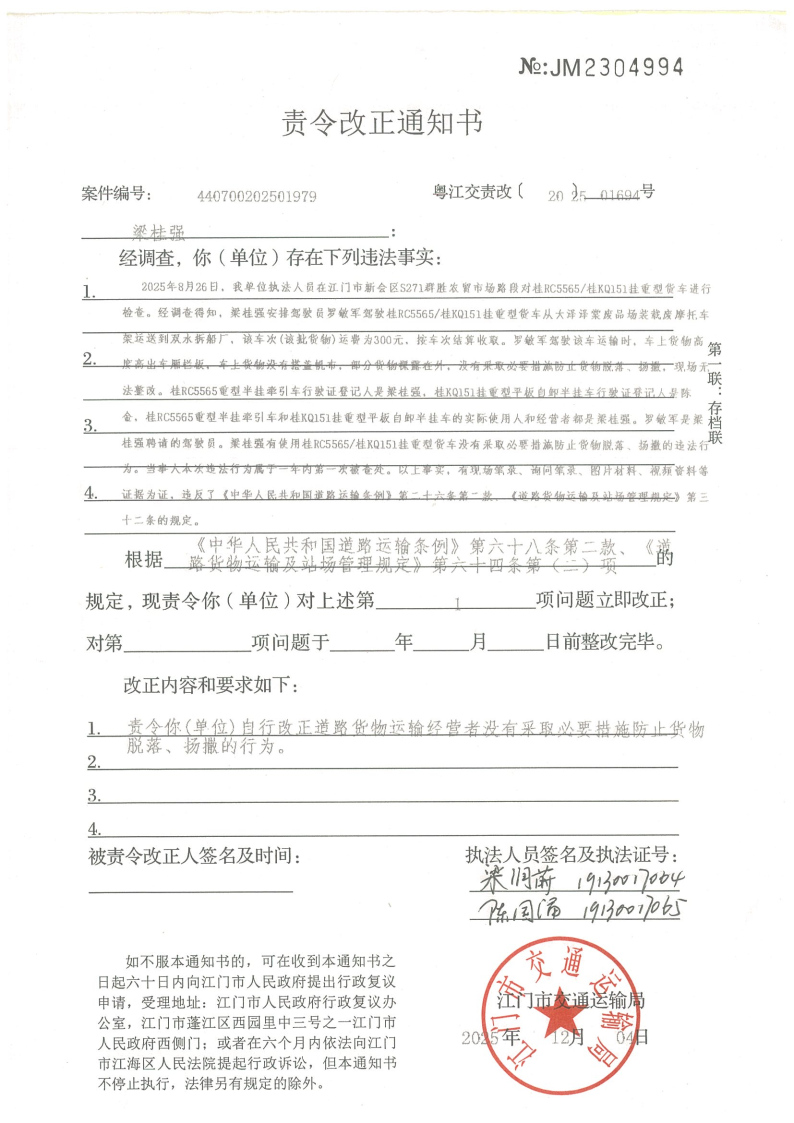 你(单位)因违反交通运输行政管理法规,本机关已作出行政处罚决定和责令改正通知书(具体内容详见附件)。依照《中华人民共和国民事诉讼法》第九十五条的规定,因无法以其他方式向你(单位)送达,现向你(单位)公告送达《行政处罚决定书》和《责令改正通知书》。自发出公告之日起,经过30日即视为送达。