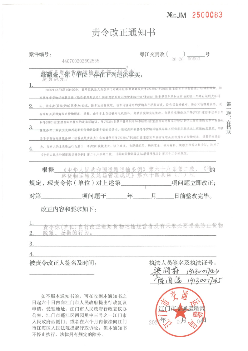 你(单位)因违反交通运输行政管理法规,本机关已作出行政处罚决定和责令改正通知书(具体内容详见附件)。依照《中华人民共和国民事诉讼法》第九十五条的规定,因无法以其他方式向你(单位)送达,现向你(单位)公告送达《行政处罚决定书》和《责令改正通知书》。自发出公告之日起,经过30日即视为送达。
