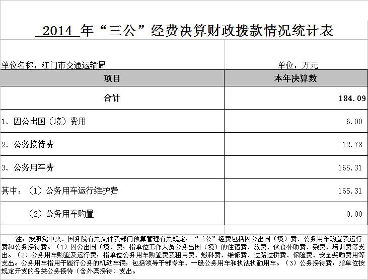 2014 年开云电竞官方网站开云电竞官方网站交通运输局(含下属单位)用财政拨款开支的出国(境)经费、车辆购置及运行费、公务接待费(简称“三公”经费)支出合计184.09万元。