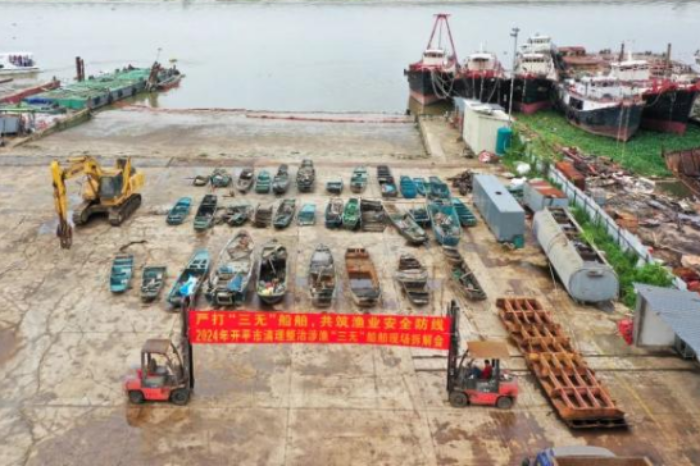 8月22日上午,开平市人民政府组织辖区公安、财政、农业农村、海事等部门和8个涉水镇(街)召开涉渔“三无”船舶拆解现场会,对前期依法查扣的33艘涉渔“三无”船舶进行集中拆解。市海洋综合执法支队副支队长钟树年带队参加。