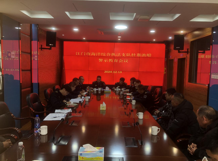 12月13日,市海洋综合执法支队支队长汪炳康带队到新会区崖门渔港召开渔船安全检查和挂靠渔船警示教育会议。